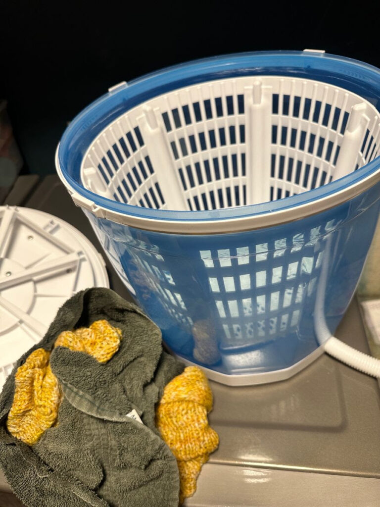 Ok, that’s an exaggeraton. But I love it. I soak the sweater in wool wash, move it to this contraption to spin the sweater dry. I then lay it flat on my washer/dryer with a fan on it, and by morning I’m wearing it!!
