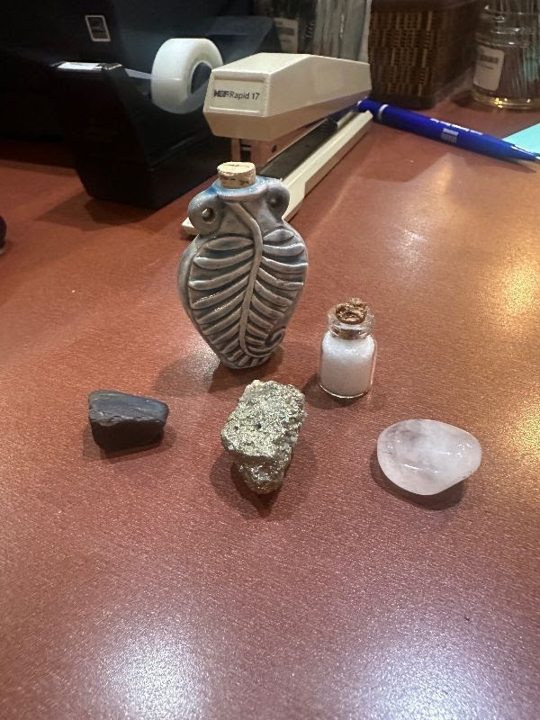 Finding the holy water inevitably leads to me pulling out the full collection of random, special, slightly woo-woo items that have accumulated over the years…at which point I must remind everyone that these things can NEVER be thrown away.