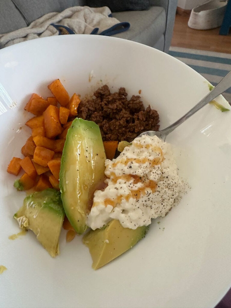 Sweet Potatoes, Taco Meat, Avocado, Cottage Cheese, and Hot Honey.